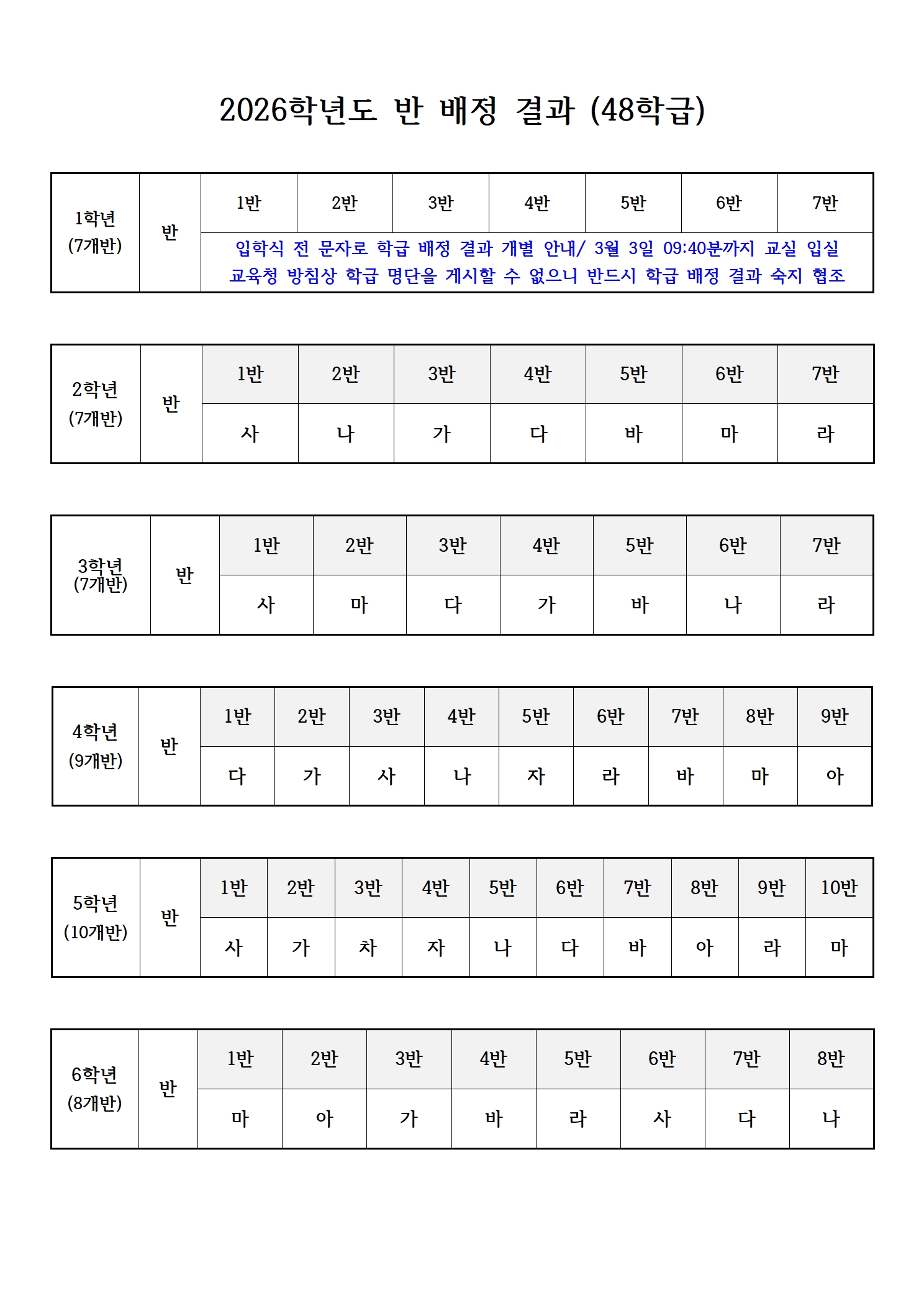 2026학년도 반 배정 결과